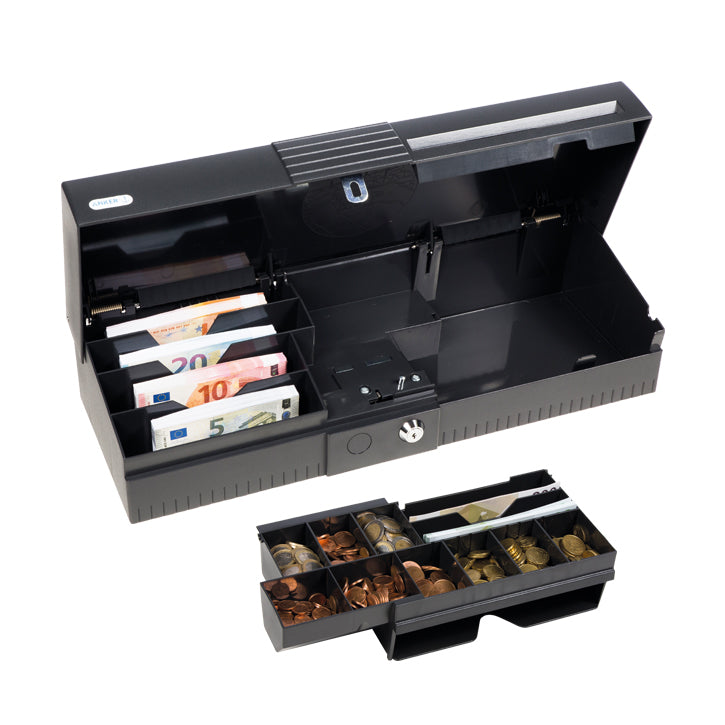 Our ANKER Euro Cash Cassette ECC is based on the same concept as the SCC. It differs in its size and the division of the coin and bill compartments. This cash cassette is our plastic cassette with the largest capacity. Its configuration allows it to be used in such a way that it can accommodate all currencies and hold a large volume of change. The ECC is also flexible when it comes to locking options. Since it is controlled and opened electronically by the POS system, it can be used completely without a lock if desired.